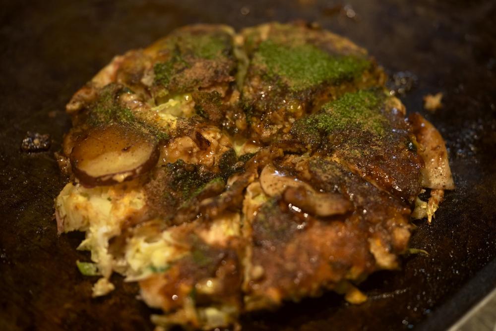 At this popular restaurant, which has been in business for more than 60 years, you can enjoy dishes that are full of Tokushima flavor. In Tokushima prefecture, there is a custom of putting sweetened kidney beans in chirashi sushi. In the same way, the culture of putting sweet potato and beans (kintoki-mame) in okonomiyaki is still preserved. This is called "mametama," or "bean ball." Naruto City's specialty, Narutokintoki, is added to this dish in the Naruto Kintoki and Bean Okonomiyaki (950 yen).
