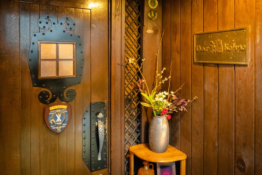 The third place we visited is Bar Kohno, located on the third floor of a building in Sakae-machi. When you get off the elevator, a massive door awaits you.
