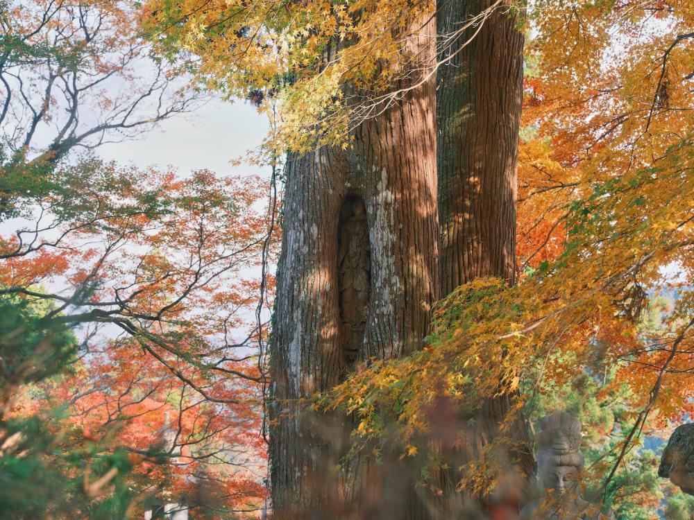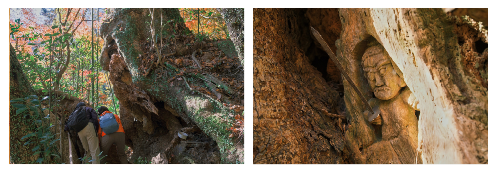 Just before the stairs, you will see the "Live Immovable Camphor Tree," a 450-year-old camphor tree with a statue of Acala carved into its trunk. You can peek inside from behind the tree and pray.