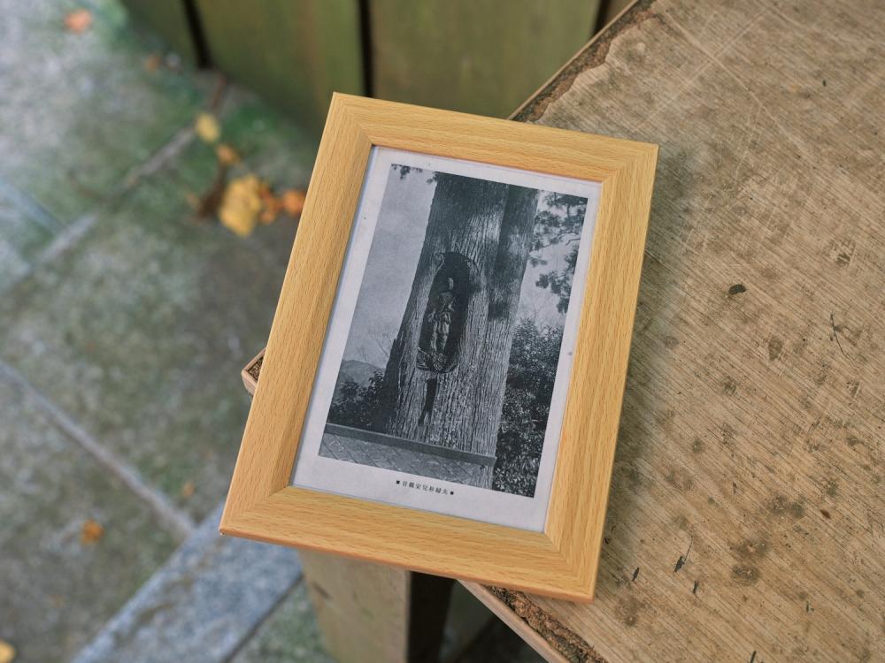 This photo, taken 20 to 30 years after the carving, shows the living tree attempting to repair the hole by pulling the Kannon statue inside.