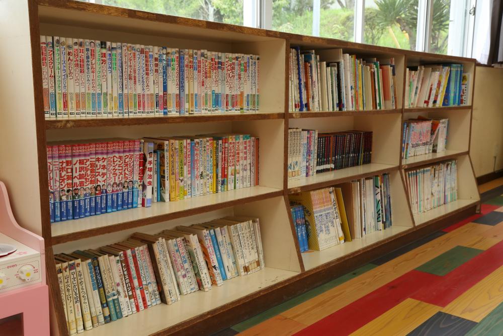 当時使用していた学校の本や黒板、棚などはそのまま使い、床をカラフルな板張りに改修しています。