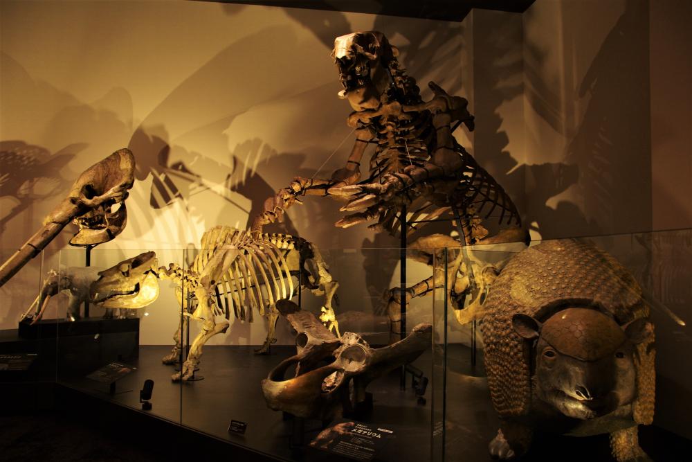 上からのぞいていたのは白亜紀前期にアフリカに生息していたと言われるマラウィサウルス。ほか、植物食恐竜の一種、プロバクトロサウルスなど迫力満点の骨格標本がそろっています。
