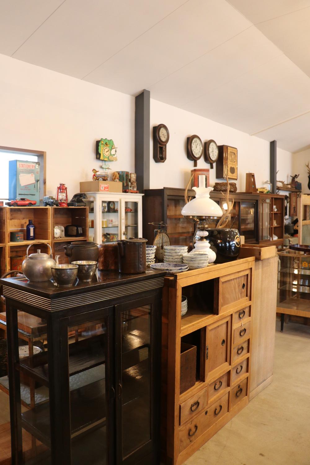 店内には食器棚にガラスケース、掛け時計、器、かご、ちゃぶ台などが並びます。
