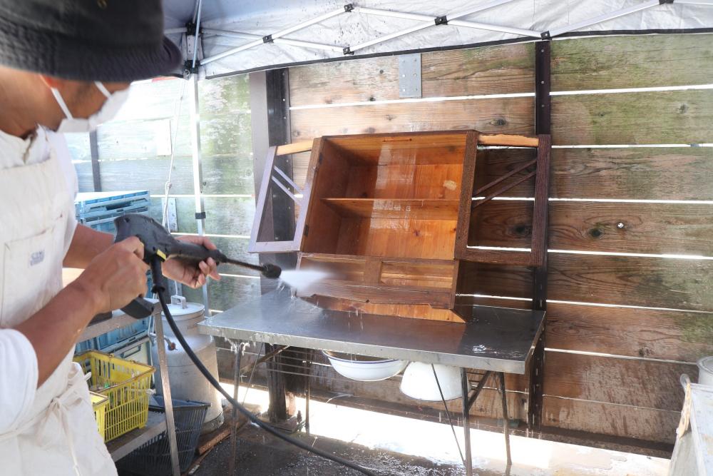 高圧洗浄機で丁寧に洗っていきます。長年降り積もったホコリなどはここでしっかり流しておくよう、入念に作業します。