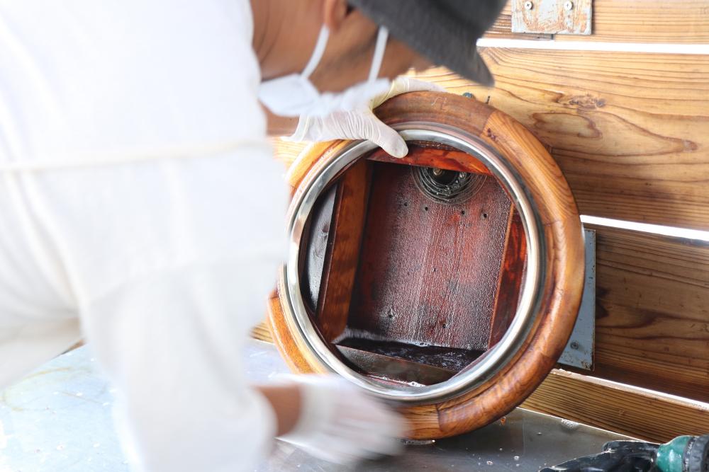 独自に配合した木材を傷めない洗剤を使い、表面の塗装を落とします。当時の塗装は弁柄や柿渋などで、木部を着色保護していることが多いそうです。