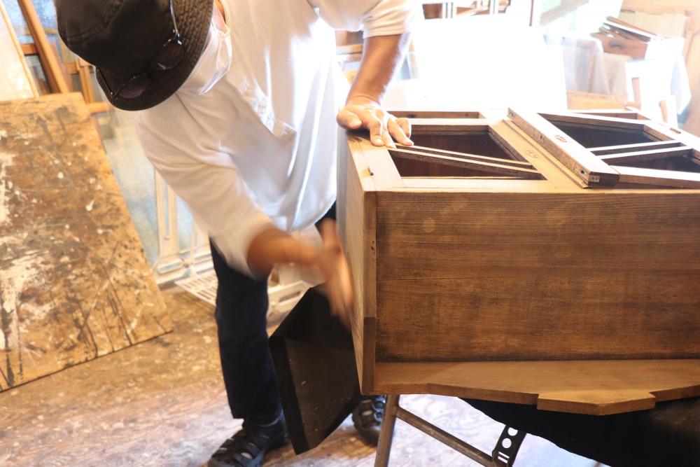 時計の木枠や本棚の表面にヤスリをかけていきます。木のささくれを防ぐとともに、元の自然な風合いを引き出していく作業です。