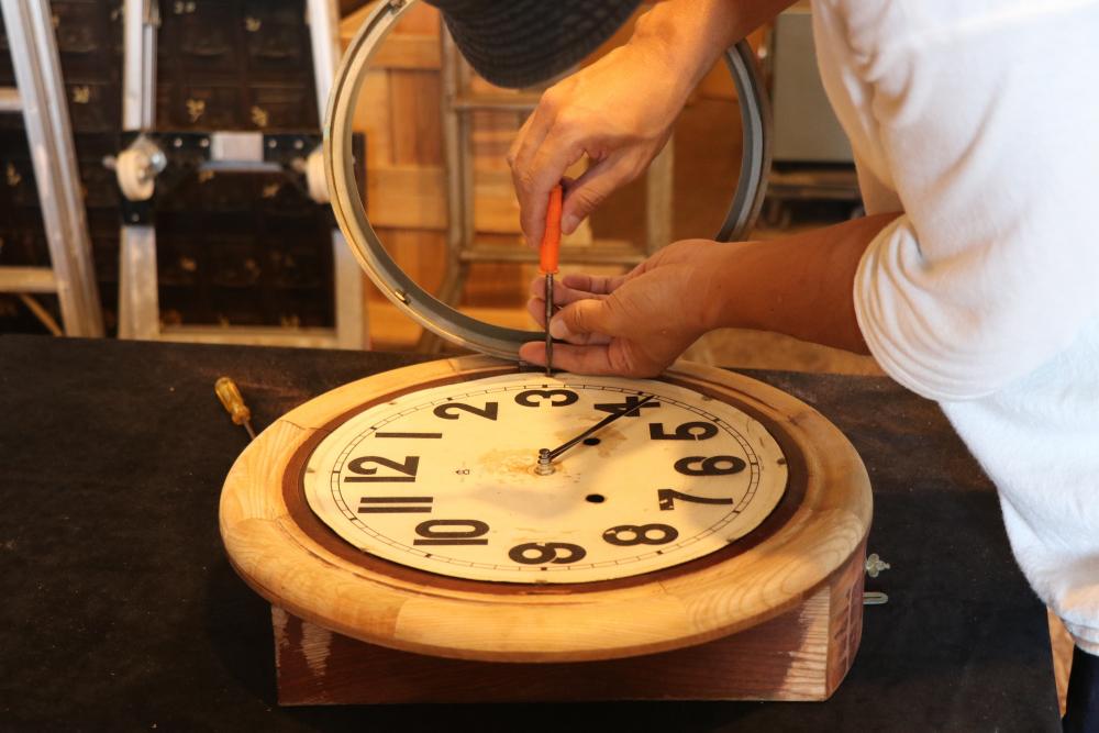 時計のムーブメントは現在の生活でも使いやすい電池式に変更することに。新しい時針・分針に付け替えて、再び時を刻み始めます。