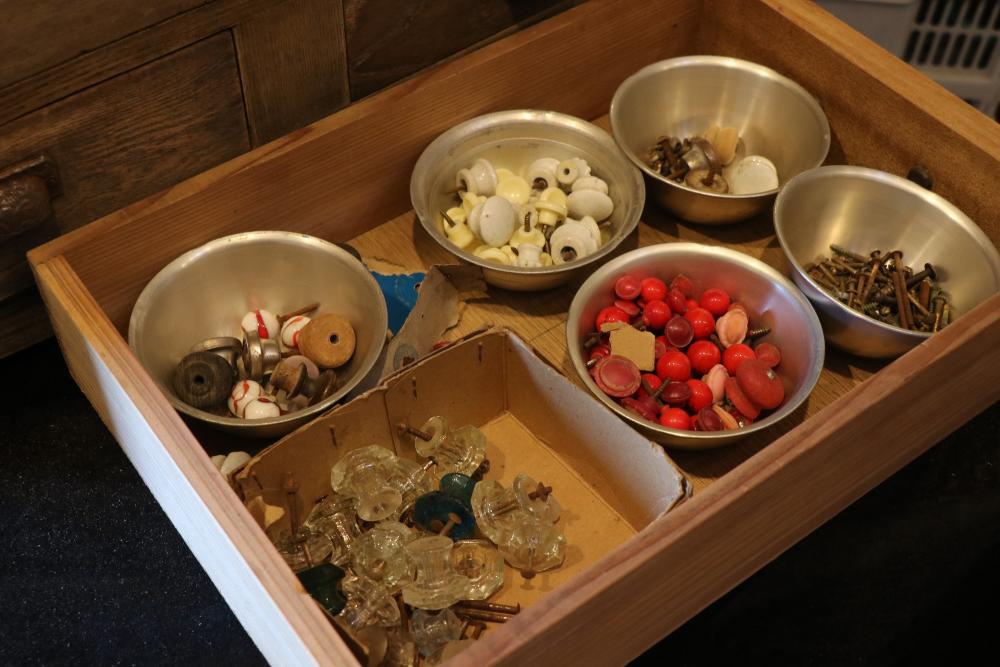 そのほか、本体は使えなくても取っ手や引き出しなど、部品だけを買い取ることもあります。「パーツ一つとっても陶器や真鍮製だったりと、味があってなじむんよな」と長年ストックしてきた昔のパーツコレクションを見せてくれた小野さん。