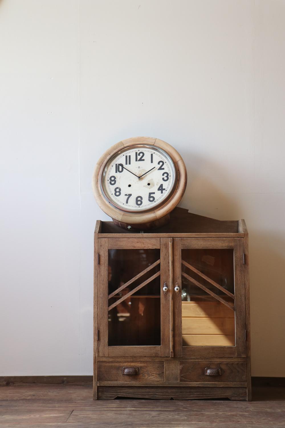 これは、無垢材で造られた本棚とケヤキでできた壁がけのゼンマイ時計。どちらも県内の古い家屋から出てきた物です。