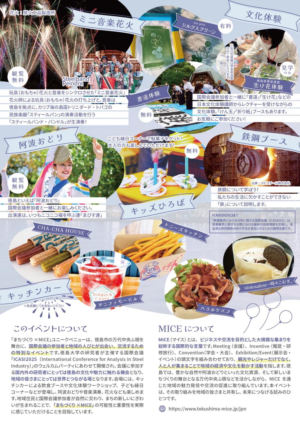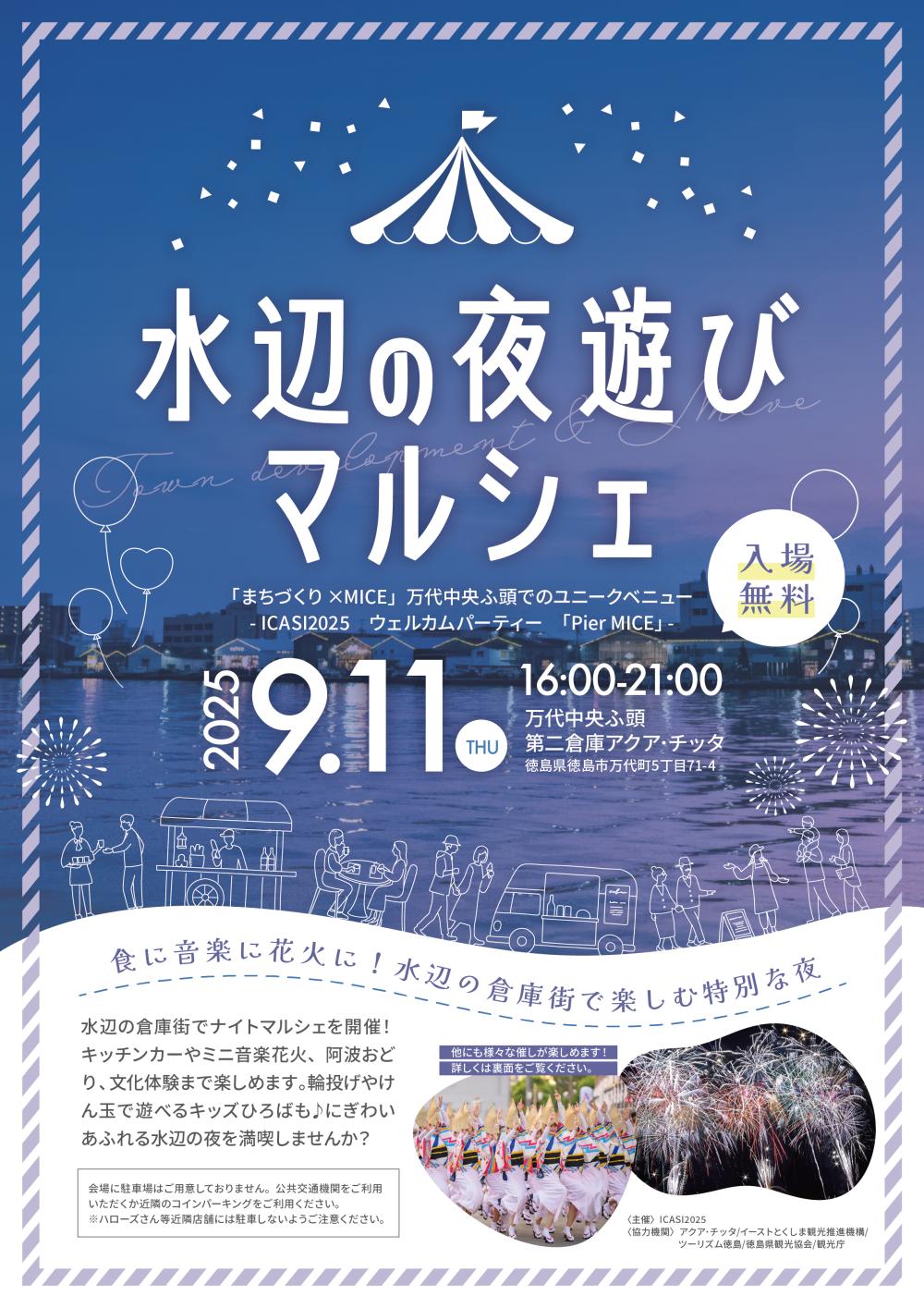 「まちづくり×MICE」ユニークべニューは、徳島市の万代中央ふ頭を舞台に、国際会議の参加者と地域の人びとが出会い、交流するための特別なイベントです。徳島大学の研究者が主催する国際会議(ICASI2025)のウェルカムパーティにあわせて開催され、会議に参加する国内外の研究者にとっては徳島の文化や魅力に触れる機会となり、地域の皆さまにとっては世界とつながる場となります。会場には、キッチンカーによる飲食ブースや文化体験ワークショップ、子ども縁日コーナーなどが登場し、阿波おどりや音楽演奏、花火なども楽しめます。地域住民と国際会議参加者が自然に交わり、まちの新しいにぎわいが生まれることで、「まちづくり×MICE」の可能性と重要性を実際に感じていただけることを目指しています。